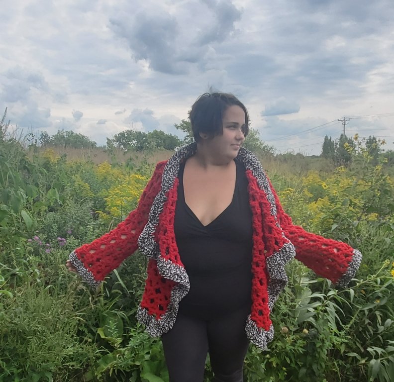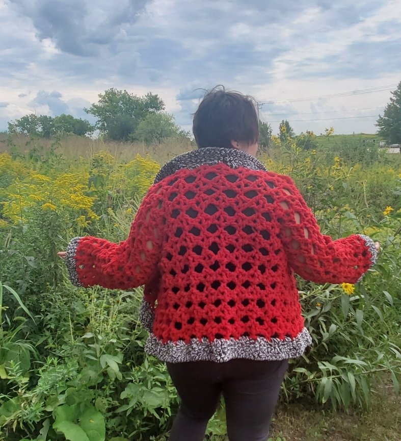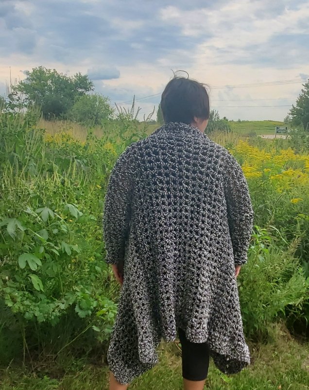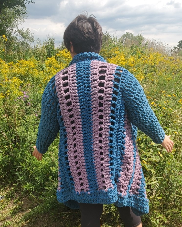 You will make 3 rectangle panels, turn them horizontally, sew them together, make armholes, create arms in the round (or make squares and sew them onto the armholes, I am not a fan of this method), and then finish with a trim around the edges to clean the piece up. If using a bulky yarn, like Bernat Blanket Yarns, it will create a cozy, blanket-like Cardigan that will keep you warm and cozy.